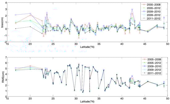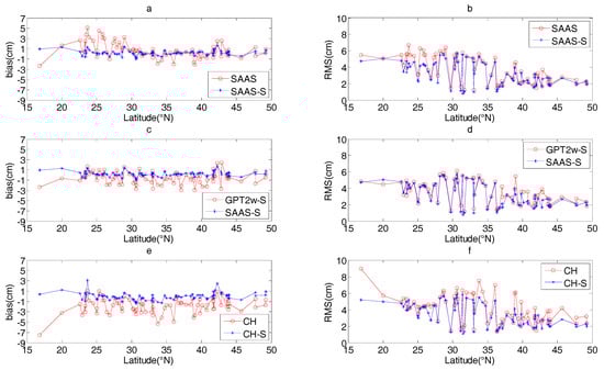 In order to illustrate the performance of these tropospheric models in the different regions, Figure 3 shows the bias (left column) and RMS (right column) values at each station, with stations aligned with respect to latitudes. Figure 3a,b show the a detailed comparison between SAAS and SAAS_S, similar results for CH and CH_S is found in Figure 3e,f. In addition, we also present the comparison between SAAS_S and GPT2w_S models in Figure 3c,d, which are a single site model built in this study and a gridded single site model.