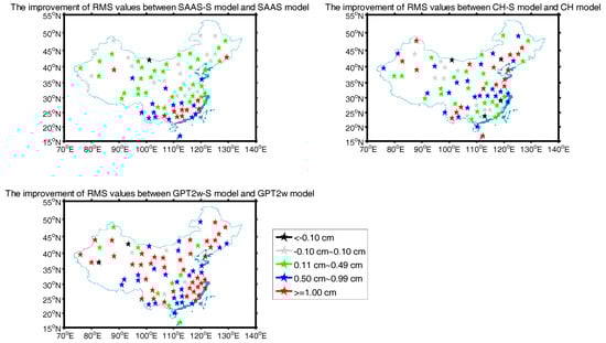 At most of the radiosonde stations, the RMS values of the corresponding models show a certain improvement compared to the SAAS, CH, and GPT2w models. In order to distinguish the detailed improvement in the RMS for the three pairs of models, we use black, gray, green, blue, and red to represent the five different types of improvement in the RMS value in Figure 4. Here, black represents that the RMS values of the new models are inferior to those of the existing models, and gray indicates a difference in the RMS values of −0.10~0.10 cm; we assume that the errors for the two models are identical when their differences are located in this range. While, green indicates an improvement in the RMS value of 0.11~0.49 cm, blue shows an improvement in the RMS value of 0.50~0.99 cm, and red shows an improvement of greater than or equal to 1 cm. The detailed results are given in Figure 4.