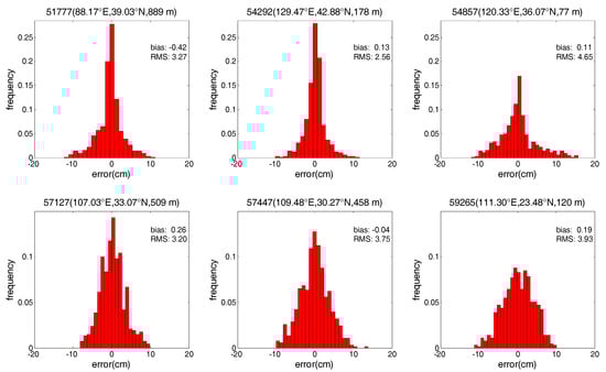 As can be seen from Figure 5 and Figure 6, the SAAS_S model has no obvious systematic errors at these six stations. In addition, most of the errors of the SAAS_S model are within ±9 cm and generally follow the standard normal distribution. In contrast, most of the errors of the SAAS model are within −15~12 cm, and most of the errors of are less centralized than those of the SAAS_S model. These phenomena show that at most radiosonde stations the accuracy of the single-site models is higher than that of the global models. Moreover the residuals of the SAAS_S model are closer to a normal distribution compared to those of the SAAS model.