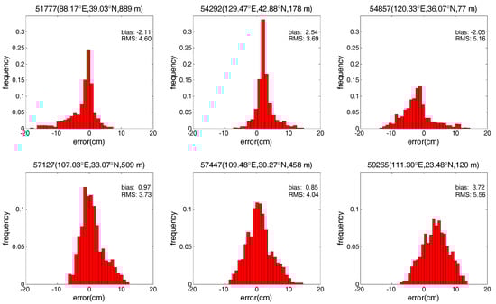 Frequency histograms of error distribution for the SAAS_S model at six radiosonde stations.