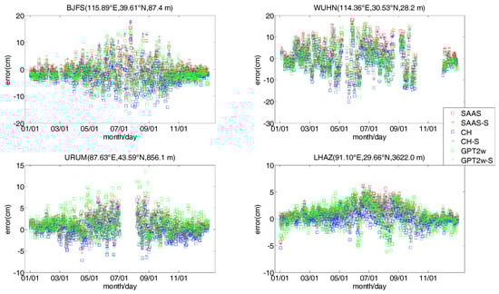As can be seen from Figure 8, the errors of each model at BJFS, WUHN, URUM, and LHAZ have apparent seasonal changes, and the absolute values and the variation of these errors are larger in summer, but smaller in the winter. About 90% of the errors for all models are within ±10 cm at BJFS, and are within ±5 cm at URUM and LHAZ, but the errors of the SAAS, CH, and GPT2w models fluctuate greatly. Additionally, about 80% of the errors for all models are within ±10 cm at WUHN, and the errors fluctuate much more in summer, which is likely related to continuously high temperatures and air humidity in the summer in Wuhan.