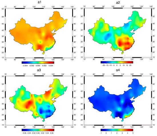 Based on Equation (14), (a1) is related to hydrostatic delay, while (a2) and (a3) are related to wet delay. The detailed variations in Figure 9 show that (a1) and (a4) have small changes at different geographic locations, while (a2) and (a3) change considerably more. Specifically, the value of (a1) is closer to the coefficient term of the SAAS model associated with the hydrostatic delay, and its spatial variation is very small, which indicates that the coefficients related to the hydrostatic delay are basically identical in different areas. Similarly, the spatial variation of (a4) is also very small. Coefficient (a1,4) are highly negatively correlated, the variation of (a1) is small, and (a4) is a kind of regional compensation. The values of (a2) and (a3) change considerably, which shows that a wet delay has obvious regional characteristics and its difference is relatively large for the different regions. However, the value of (a2) increases with a decrease in latitude, and the value of (a2) is larger in the southeast region than in the other regions. By contrast, the change of (a3) is opposite to (a2), showing that the value of (a3) is smaller in the southeast region than in the other regions.