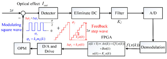 Digital closed-loop detection with square-wave phase modulation and step-wave feedback is utilized to lock the interference light intensity in the null point of sine function and demodulate Pockels phase. Thus, Equation (8) can be simplified as