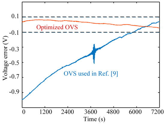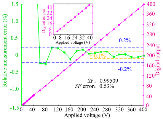 Figure 8 proves the good linearity of the OVS in the low voltage range 0–40 V. Moreover, the OVS measurement accuracy is better than ±0.2% if the applied voltage is greater than 100 V, and the measurement accuracy is better than ±0.1% with applied voltage greater than 200 V. The result verifies that the closed-loop OVS has reached the design accuracy of 0.1 level above 200 V. And the measurement error can be 0.1% only if the applied voltages exceed 500 V in [