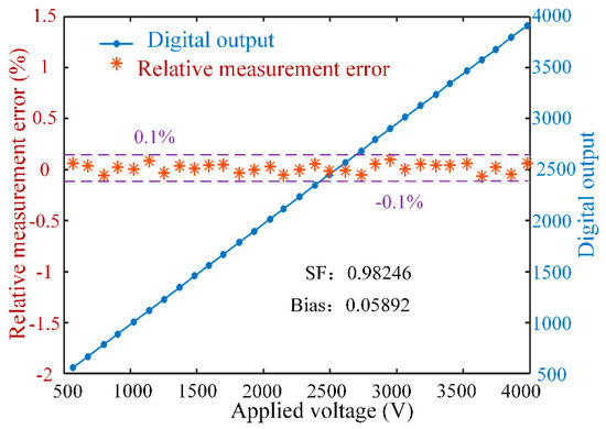 Finally, the accuracy of OVSs under AC in the voltage range 500–4000 V was measured to further verify the correctness of the control algorithm. The result of digital output and relative measurement error, as shown in
