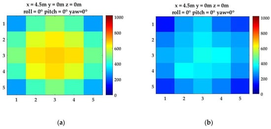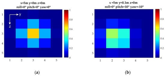 Sample simulator outputs for different relative geometries between the light source and the light detector array with pixel intensities normalized at maximum intensity obtained at x = 4 m: (a) alignment with x = 5 m offset; and (b) translation (along the y-axis) and rotational offset (pitch and yaw).