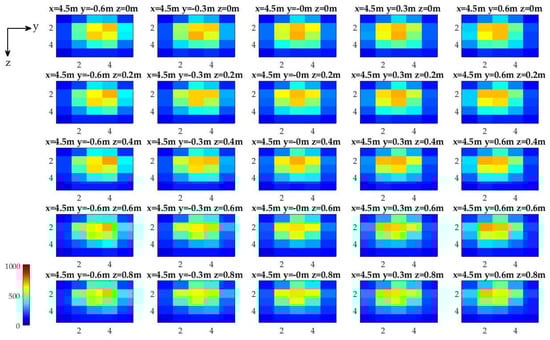 Translational offsets between the optical detector array and the light source are varied from 4.5 m to 8.5 m at 1 m increments along the x-axis, from −0.6 m to 0.6 m at 0.3 m increments along y-axis, and from 0 m to 0.8 m at 0.2 m increments along z-axis. The light source is located at the origin (i.e., x = 0 m, y = 0 m, and z = 0 m). A total of 125 different position configurations are used for calibration with 200 samples collected at each configuration (Figure 4). The photodiode intensity variations for all calibration measurements are approximately 1% of the maximum photodiode intensity. The image intensities are not perfectly symmetrical about the y- and z-axis (i.e., with reference to y = 0 m and z = 0 m). A possible explanation is potential geometrical misalignments in the experimental setup and non-uniform water conditions that may have caused sub-pixel (i.e., between two detectors) shifts of the light field with respect to the detector array.