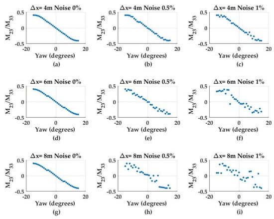 ratio values for changing yaw angles at varying x-axis offsets (4 m, 6 m, and 8 m) and noise levels (0%, 0.5%, and 1.0%) and with y- and z-axis offsets at zero: (a) = 4 m, noise = 0%; (b) = 4 m, noise = 0.5%; (c) = 4 m, noise = 1%; (d) = 6 m, noise = 0%; (e) = 6 m, noise = 0.5%; (f) = 6 m, noise = 1%; (g) = 8 m, noise = 0%; (h) = 8 m, noise = 0.5%; and (i) = 8 m, noise = 1%.