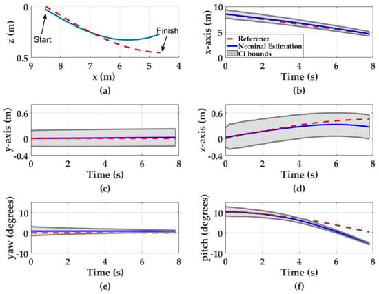 Monte Carlo simulation results when UUV undergoes diving motion. Red dashed curves denote the UUV motion, blue curves denote the nominal position estimations and the gray regions denote the 95% CI. (a) The UUV trajectory in diving motion; (b) x-axis estimations; (c) y-axis estimations; (d) z-axis estimations; (e) yaw estimations; and (f) pitch estimations.