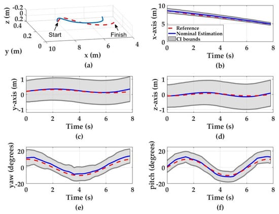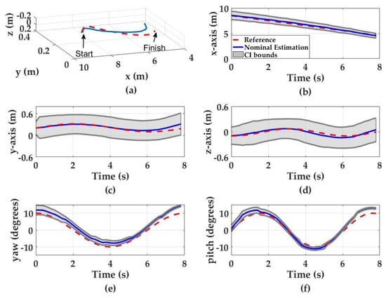 Monte Carlo simulation results for three-dimensional zigzag motion. Red dashed curves denote the UUV motion, blue curves denote the nominal position estimations and the gray regions denote the 95% confidence interval. (a) The UUV trajectory in zigzag motion (3D space); (b) x-axis estimations; (c) y-axis estimations; (d) z-axis estimations; (e) yaw estimations; and (f) pitch estimations.