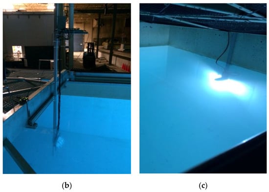(a) Schematic diagram of the experimental setup in the wave and tow tank; (b) image of the detector array submerged into the water on the moving carriage platform; and (c) image of the light source mounted on the wall of the tank.