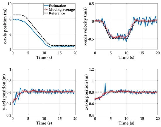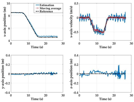 For Test 1, the initial state is such that x = 8.5 m, y = 0 m, and z = 0 m, and the final state at x = 4.5 m, y = 0, and z = 0 m. This first set of empirical results shows that the detector array estimation performance is highly accurate throughout the detector array motion (see Figure 10). At the initial state (x = 8.5 m away from the light source), position estimation errors for all axis are within 0.02 m. Here, because the estimation results for y-axis, z-axis and x-axis velocity estimates are noisy, they are smoothed with a moving average window (bin size: 10 samples).