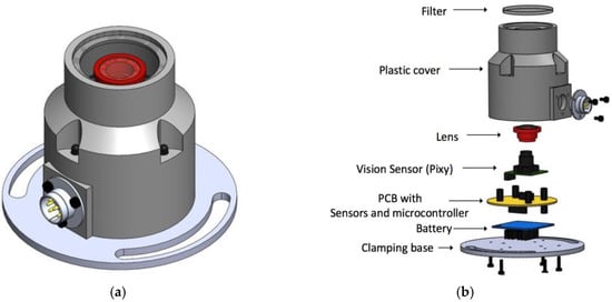 The solar position sensor has a cylindrical geometry, as seen in Figure 1a, where one can find the assembly structure and the electronic devices that make up the sensor Figure 1b shows the upper tempered darkened glass with a thickness of 3 mm, which acts as the solar radiation filter with ultraviolet and infrared wavelengths, the wave type that is not visible to the sensor that can cause heating and deterioration of the vision sensor. The filter is made from a Lens Protection lens of shade 14 used in welding helmets. This lens blocks artificial light or diffuse solar radiation, so that the detection of the Sun is not affected. The structure has connectors and a holding base with neodymium magnets and grips to hold it, occasionally or permanently, to the base to be evaluated.