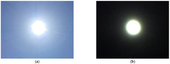 Image of the Sun viewed from the sensor (a) Real view of the Sun; (b) Sun viewed through the filtered visual sensor.