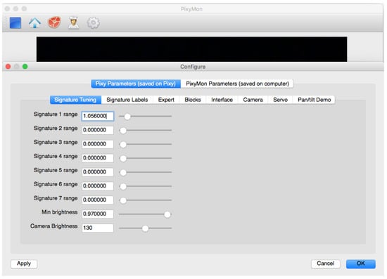 Interface and parameters of the vision sensor in the Pixymon environment.