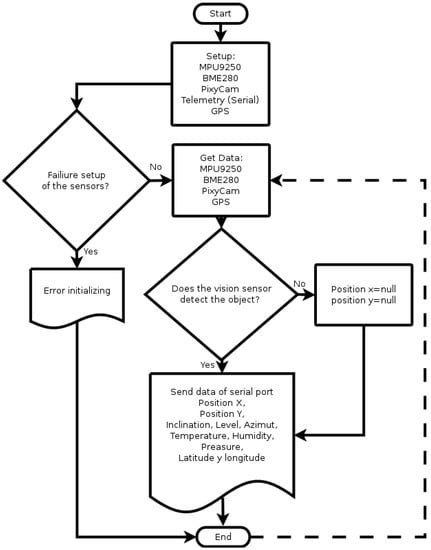 The algorithm to determine the focus error of Figure 6, which was implemented in the ATmega microcontroller, starts by loading the calibration values and initializing the inertial measurement sensor (MPU9250), temperature, humidity and altitude (BME280), GPS, telemetry and the Pixy vision sensor. If any of the sensors fail at initialization, an error message is sent to the interface and the cycle is terminated. When the sensors are initialized correctly, the positions of the vision, inclination, level, azimuth, temperature, humidity, latitude and longitude sensors are obtained. In the case that the vision sensor does not detect an object, null values are assigned to the positions in order for the user interface to distinguish when an object is detected; to finish, they're sent through the serial port where it is wirelessly connected. The algorithm shown indicates the process performed in the first iteration, the continuous operation, would be repetitive from the data acquisition of the sensors.