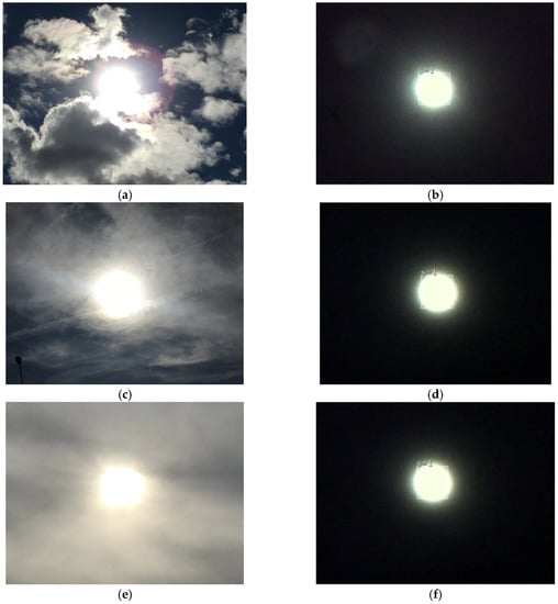 Cloudy real images and images viewed through the vision sensor. (a) Real view of the Sun partially cloudy; (b) Sensor view of the Sun partially cloudy; (c) Real view of the Sun nebulous cloudy; (d) Sensor view of the Sun nebulous cloudy; (e) Real view of the Sun cloudy; (f) Sensor view of the Sun cloudy.
