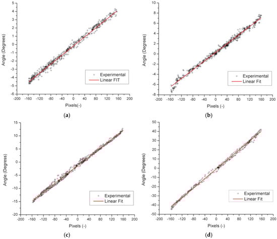 Characterization and adjustment of pixels to degrees with different lenses in degrees: (a) With lens of 12°; (b) With lens of 21°; (c) With lens of 42°; (d) With lens of 75°.