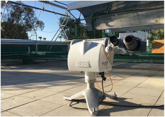 The validation of the solar position sensor was performed by determining the focus error of one of the best commercial solar tracking systems of Kipp & Zonen (SOLYS 2), which ensures a solar tracking with 0.02° of accuracy in active mode. Figure 9 shows the configuration of the experiment. The white mechanism is the SOLYS 2 with its sensor and pyreliometer. On the right side a base to place the solar position sensor can be seen. The SOLYS 2 solar tracker works independently of the solar position sensor. In the experimental study, the variables of azimuthal and zenith approach, temperature inside the sensor, ambient temperature and solar radiation were recorded every 1 s.