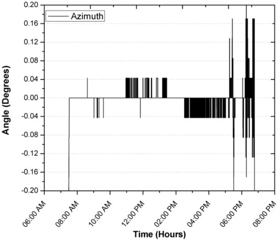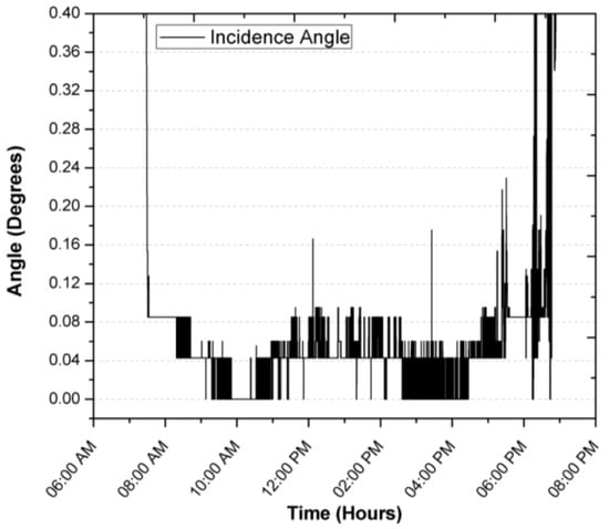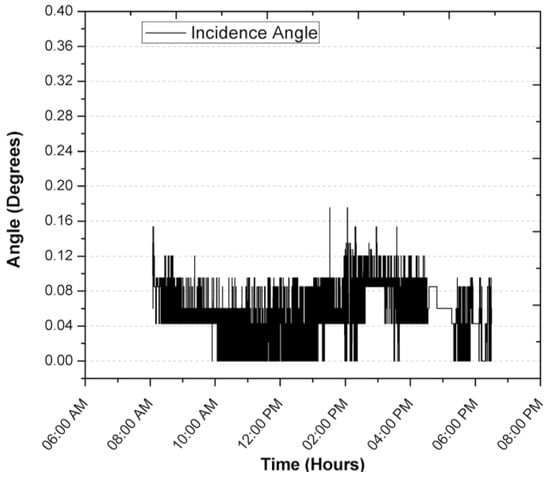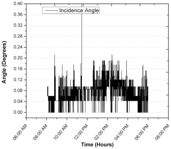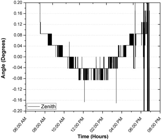 During the registration of the first day of operation of the sensor, there was an average focus error of 0.0065°, 0.04196° and 0.04588° for the azimuth, zenith and incidence angles, with modes of 0°, 0.0426° and 0.0426°, resulting in the largest error being obtained for the angle zenith. After explaining a day of operation in detail, and in order to demonstrate the consistency of the sensor, the error of the angle of incidence in two days of operation is shown in Figure 14 and Figure 15. The incidence angle error of the second day indicates 0.02039°, 0.04021° and 0.04304° for the azimuth, zenith and incidence angles, with modes of 0°, 0.0426° and 0.0426°. On the third day we obtained 0.04885°, 0.04172° and 0.07455° for the azimuth, zenith and incidence angles, with a mode of 0.0426°, 0.0426° and 0.0426°.