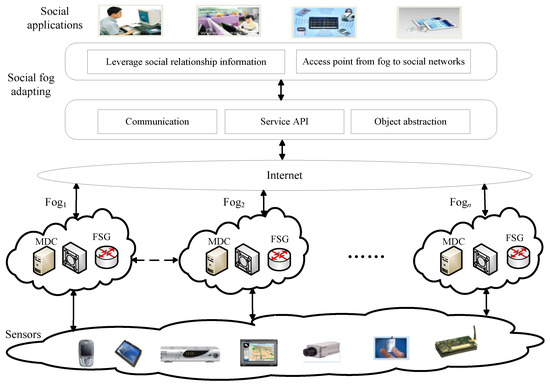 The concept of fog computing was presented to make the cloud computing framework better suited for data sources, such as sensors, in the Internet of Things (IoT) [1]. The core idea of fog computing is front-end intelligent, that is, using special equipment or network equipment to provide computing, memory, and network communications services between the cloud server and terminal equipment. Recently, fog computing has been regarded as a new networking and computing model for sensor networks, Internet of vehicles, smart grids, etc. Therefore, it brings great benefits by integrating fog computing and existing networks. Meanwhile, for the objects from the IoT to the cloud, it is a new trend that these objects establish social-like relationships with each other, with the benefits of efficiently bringing developed sociality to a complex environment. The integration can form social relationships with the benefits of network boundary extensions and network scalability. Thus, the social attributes and capabilities can be assigned to the nodes in communication networks, which makes them important parts of social networks. Recently, the social networking model has been introduced into advanced social networking, sensor networks, smart grids, the cloud, etc. The basic model combining social networks and the Internet of things was proposed in [2], in which related benefits were discussed deeply. Moreover, some important topics, such as context awareness, service architecture, and trustworthiness management, etc., are studied widely [3,4,5], especially for typical application systems (e.g., social body sensor networks). Additionally, a novel incentive scheme for a cyber-physical social system (CPSS) was proposed based on the reputation of social users [6]. In addition, University of Glasgow, UK, proposed a real application system of the social IoT in the smart city, in which the sensors can be integrated with the social network system (e.g., Twitter), thus the citizens can use and share the sensing data and improve the intelligence of the smart city [7]. Moreover, a novel framework was proposed to deliver content in vehicular social networks with D2D communication [8]. At the same time, the social cloud is also a new resource and service sharing framework utilizing relationships established between members of a social network [9,10]. In the work of [11], a social virtual object architecture was proposed for the edge cloud. However, this work focused on the social edge cloud but not real social fog. Based on aforementioned analysis, although there are some existing social architectures for various networks, cloud and edge cloud, social fog is still an open issue. In fact there are several drawbacks in these existing systems. Firstly, in most social cloud computing systems, the social relationships are established for the concentrated cloud center, which cannot provide adequately flexible, secure, and collaborative services for the network edge. Secondly, in the existing social sensor networks, the social networking model is introduced among the sensor nodes. However, because of constrained computing and storage resources of the sensors nodes, the efficiency of the social organization is limited. Thirdly, in traditional fog computing systems, the social relationship for the fog nodes has not been considered, thus the efficient and flexible service needs to be improved.