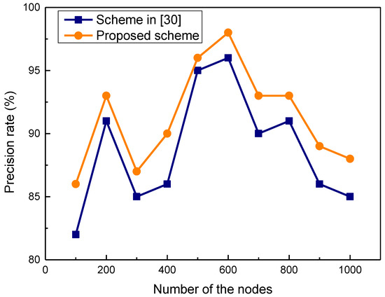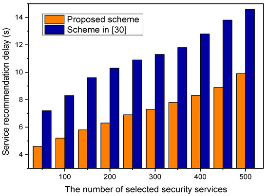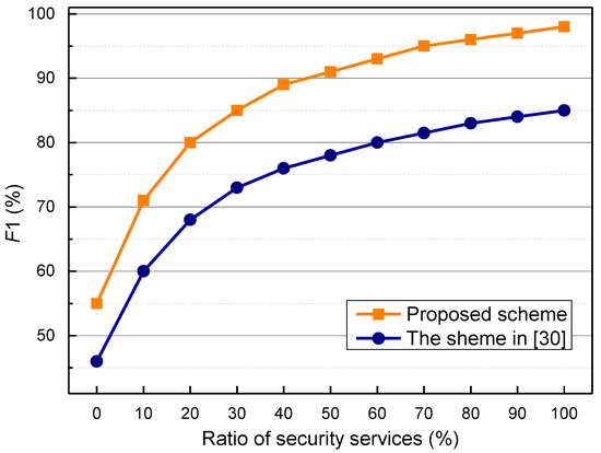 We take d = 0.7 and z = 0.5 as an example of the parameter setting for the simulation. In fact, these two auxiliary adjustment factors are not the main parameters in the security services recommendation algorithm. In other words, d and z have no important impact on the security recommendation algorithm, and are just given for the running of simulations. The comparisons of security service recommendation delay are shown in Figure 4. As shown in the figure, the service recommendation delay of the proposed scheme is obviously lower than that of the scheme in [30]. In the proposed scheme, robustness and prediction capabilities can be obtained based on PSO and chance discovery; thus, the recommendation speed of the proposed scheme is faster. In Figure 5, it is obvious that the precision rate of the proposed scheme is higher than that of [30]. This is because the proposed security mechanism is based on chance discovery and crowd sensing. The recommendation faults are caused by the dynamics of the nodes and communications, which make the recommendations unavailable or have inconsistent descriptions. Next, evaluations and comparison of the F1-measure are performed. The simulation results of the F1-measure dependent on the security service ratio are shown in Figure 6. When the ratio of security service is lower than 20%, the value of the F1-measure is obviously low. If the ratio of security service is higher than 20%, the value of the F1-measure increases obviously and is near its peak when the F1-measure is more than 98%. The F1-measure of the proposed scheme is higher obviously than that of [30].