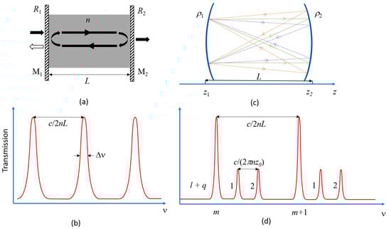 (a) Schematic of a Fabry-Perot resonator consisting of parallel mirrors M1 and M2 with reflectances of R1 and R2, respectively, surrounding a cavity medium of refractive index n and thickness L. Light introduced from one side undergoes multiple reflections, leading to partial transmission from the other side; (b) Typical transmission of a planar FPC depicting frequency spacing (i.e., the FSR) of adjacent longitudinal modes and the full-width at half-maximum (Δν) of an individual modal peak; (c) Schematic representation of a curved-mirror FPC with length L, where mirrors with radii of curvature ρ1 and ρ2 are placed at z1 and z2, respectively; (d) Typical transmission spectrum of a curved-mirror FPC as a function of mode numbers l, q, and m, where ρ1, ρ2 >> L is assumed.