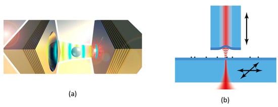 (a) Schematic representation of an open-access microcavity with a flat and a concave mirror. A nanoparticle in solution, trapped inside the optical mode is shown [51]; (b) Conceptual diagram of a laser-machined fiber with multilayer mirror on its end along with a flat mirror serving as a sample holder; black dots represent nanoparticles located on the flat mirror [52].