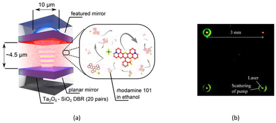 (a) Schematic representation of an open-access microcavity with a flat and a concave mirror filled with a rhodamine 101 solution [59]; (b) Simultaneous laser emission from four spherical mirror FPCs [22].