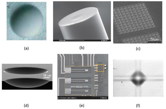 Microscope images of (a) a dimple with diameter of 200 μm formed by a bubble-trapping method [76]; (b) a laser machined fiber end facet [12]; (c) array of concave features made by FIB milling [11]; (d) two silicon micro-mirrors fabricated by dry etching [78]; (e) array of cantilever based micro-mirrors [79], (f) and a microscope image of a waveguide connected buckled-dome microcavity. The dome diameter is 100 μm [80].