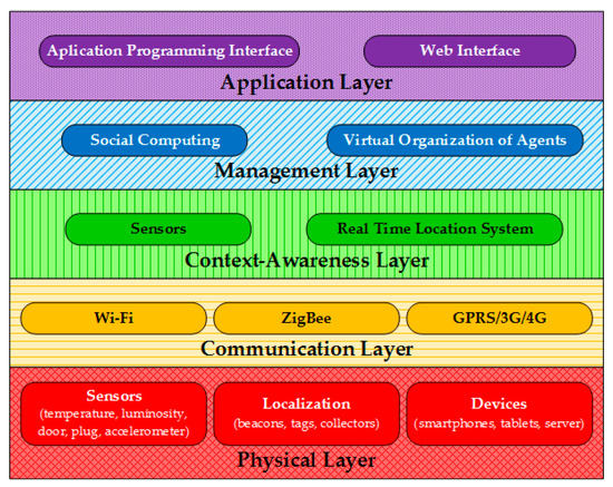 - Devices: Devices are all the equipment needed by the system that does not produce context-aware or localization data. This includes mobile devices such as smartphones or tablets which serve as an interface and are used to provide users with recommendations. In addition, the server that is deployed to store data and run the management system, including the localization engine and the social machine. Finally, it includes a protocol converter which acts as an intermediary between the sensor and localization infrastructure and the Internet.