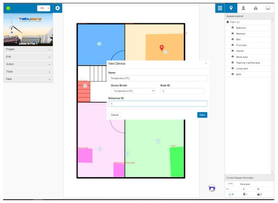 - Application layer: This layer includes tools which configure all the sensors and define the areas of interest, such as beds (to identify when users are sleeping), couch (watching TV, reading, etc.), work areas (washing machine, cooker, etc.), front door, etc. Further, these tools also include mechanisms that define the activities to be identified or the conditions in which a recommendation should be triggered. Figure 3 shows the interface of the context-aware and localization systems, including the menu where new sensors in the system are registered.