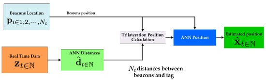 - Position estimation: The second phase calculates the position of the target, , by using the distances calculated in the first phase, , and the beacons’ fixed location within the environment, . The distance estimates and anchors’ positions are introduced in the second ANN (MLP) that estimates the target’s position from the input data [,]. This ANN has been trained by an error back propagation algorithm with positions obtained by the application of a trilateration algorithm to the distance estimates. This algorithm calculates the maximum likelihood (ML) of adaptive distributions based on kernel mixtures []:For the trilateration algorithm, we use a Gaussian kernel due to the tractability constraints of the ML. However, by using the ANN, we avoid the high processing times required by other kernels, by dealing with the complexity vs. accuracy trade-off. The number of neurons of the ANN is in the input layer, in the hidden layer, and 1 in the output layer.Figure 5 shows how the problem is resolved in a schematic way. This model will provide the position of the tags within the localization environment, at every second.