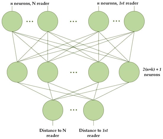 - Distance estimation: During the first phase, the engine calculates the most probable distance between the target and the anchors, , based on the RSSI level, . These values are calculated by using time series applied to ANN (Artificial Neural Network). ANNs permit for the use of time series, making it easier to forecast in situations where the estimation of the position from non-independent values with consecutive samples is not possible. Thus, the ANN is able to forecast a value according to the historical records. More concretely, an MLP (MultiLayer Perceptron) is used to provide a value according to the historical values []. Therefore, the neural network in this study is fed with both the current detected RSSI value and the RSSI values detected in previous time instants, . The ANN has been trained considering several anchors at the same time to avoid the multipath effect. It is formed by input neurons, with the lag or number of previous times recorded. The intermediate layer of the Neural Network uses 2 neurons and is configured following the Kolmogorov Theorem [].Figure 4 shows that the ANN includes a number of input groups equal to the number of anchors considered in the estimation. Finally, the classification of the groups of input neurons is made attending to the current RSSI signal, with the first neuron corresponding to the reader that receives a higher RSSI and the last, the one that receives the lowest.