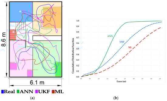 As Figure 6 points out, the proposed two-step ANN obtains lower errors than conventional techniques, obtaining a RMSE (Root Mean Squared Error) of 1.66 m for the ANN, 2.53 m for the UKF and 3.26 m for the ML approach. This level of accuracy is highly useful for determining the position of each user inside the house, identifying when they are sitting on the sofa, cooking or at the front door ready to leave.