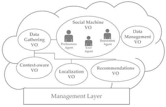 The emergence of the Social computing paradigm enhanced collaboration between humans and machines, solving social problems by using innovative sociotechnical tools []. Virtual organizations (VOs) of agents are postulated to be one of the most powerful tools for their support []. Some of the functionalities that make them a strong candidate, are their ability to control agent behaviours by the inclusion of normative regulations, their dynamism when forming agent groups and when managing the entry and exit of components, and their ability to describe functional behaviours and structural compositions []. The application of Social Computing techniques leads to the creation of Social Machines, entities that are managed by both technical and social practices. Examples of such entities are the Twitter dynamics prediction system, which uses behavioural data [], or the Amazon recommendation system [].
