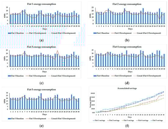 Daily energy consumption during the baseline and the experimentation periods in each flat (a–e); and accumulated savings (f). The results demonstrate the reduction in consumption and the lineal tendency shows how players acquire good habits along the experimentation.