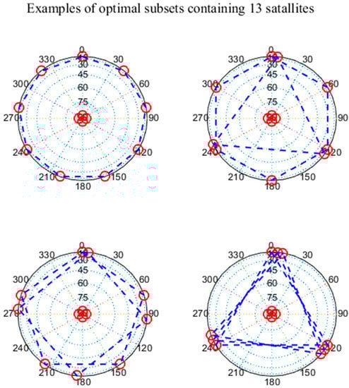 Skyplots of optimal subsets containing 13 satellites obtained with the Geometric Dilution of Precision (GDOP) method.