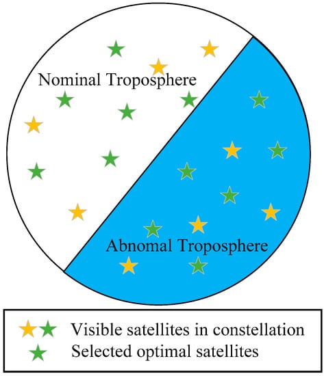 This paper analyzes troposphere meteorological data of eight International GNSS Monitoring Assessment System (iGMAS) stations and 10 International GNSS Service (IGS) stations in China and records the most serious conditions during 2015 and 2016. To eliminate the integrity risk caused by non-nominal troposphere error, this paper presents a method for bounding the conspiring error []. Given the influence of abnormal troposphere error on VPL, an effective method is proposed, which can greatly decrease the non-nominal troposphere error in positioning solution. The average VPL increase caused by non-nominal troposphere error is 1.15 m using the proposed method, which corresponds to a 1.17 m reduction. Moreover, compared with the brute method and the greedy method, the running rate of the proposed method is improved by 390.91% and 111.65%, respectively. In summary, the new method minimizes the non-nominal troposphere error in the positioning solution and airborne VPL under severe troposphere conditions, while improving both the GBAS integrity and the running rate. An illustration of the selected optimal subset is presented in Figure 2, which indicates that the final optimal satellite subset should achieve a balance between non-nominal troposphere error and satellite geometry rather than just choose the satellites with smaller non-nominal troposphere error.