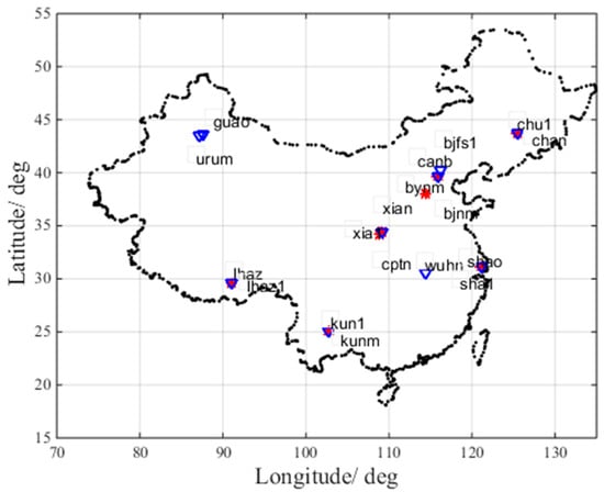 Figure 3 shows the locations of the eight iGMAS stations and 10 IGS stations in China. The red asterisks represent the iGMAS stations, while the blue triangles represent the IGS stations.