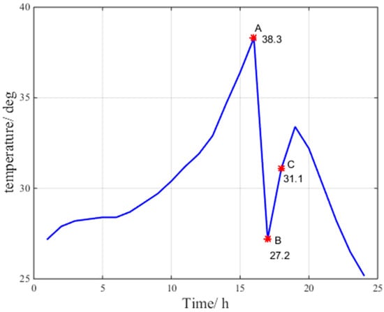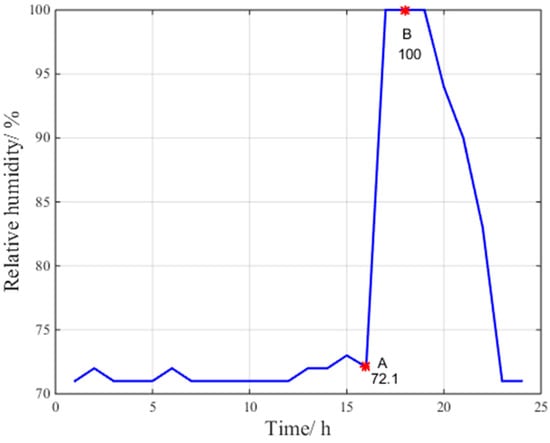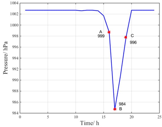 According to the data at points A, B and C for pressure, relative humidity and temperature in Figure 4, Figure 5 and Figure 6, respectively, the troposphere meteorological parameters at the Beijing fangshan station on 24 July 2016 are observed to fluctuate remarkably, indicating abnormal troposphere conditions. Clearly, the maximum change in pressure is 15 hPa/h, the maximum change in temperature is 11.1 °C/h, and the maximum change in relative humidity is 27.9%/h.
