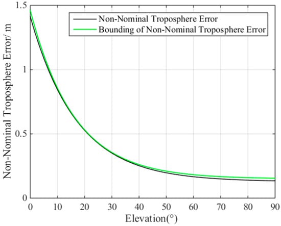 The black line in Figure 9 represents the largest non-nominal troposphere error at different elevation ranges, while the green line represents the fitted non-nominal troposphere error curve, which is a function of satellite elevation. According to the fitting results, the non-nominal troposphere error is:
