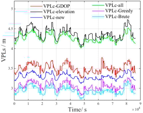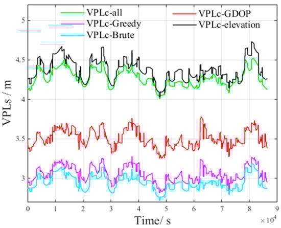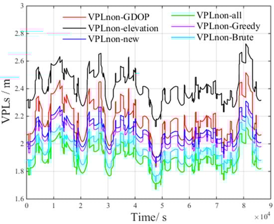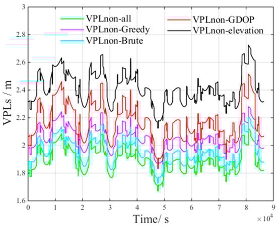 According to Table 4, the  of the brute method and the greedy method increase by less than 5% compared with the VPL of all visible satellites, which meets the GBAS integrity requirements []. Thus, the number of satellites in the optimal subset is set to 16.
