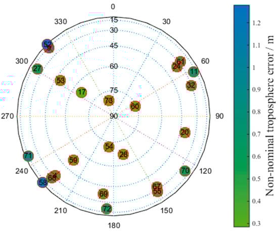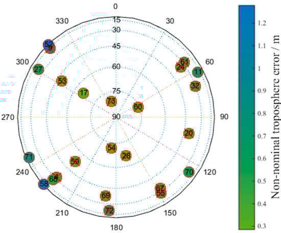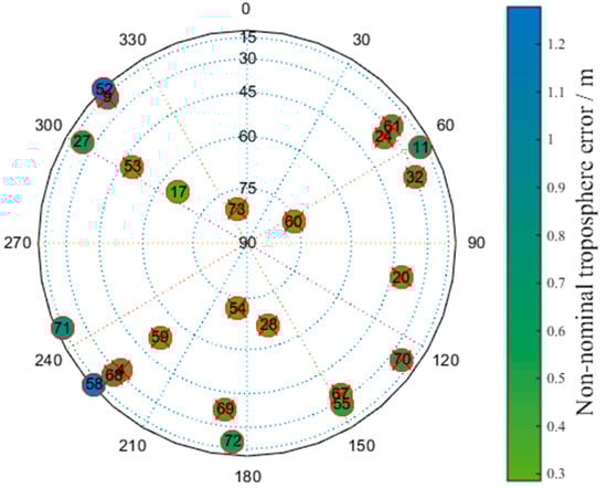 Taking the Linzhi airport as an example, when the height between the aircraft and the ground station is 30 m, the non-nominal troposphere error can be obtained, as shown in Figure 9.