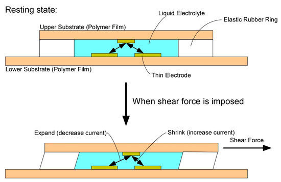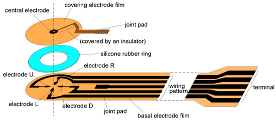 To date, we have been developing a shear force sensor composed of only soft materials such as flexible film electrode (capable of bending, but not stretchable), elastic rubber, and liquid electrolyte [23]. One of the advantages of using liquid electrolyte is that the contact resistance at the surface of the electrode is stable because the electrolyte does not peel off from the electrode even after repeated deformation. Recently, several types of tactile sensors using a liquid conductor have been developed. Some use ionic liquid [24,25], and others use metal liquid [26,27]. In our case, we used liquid electrolyte, as the conductivity is easily controllable by simply changing the concentration of the ionic species. In this case, if a voltage is applied while the electrode and the liquid are in contact with each other, an electrochemical reaction occurs on the surface of the electrode, and the electrode may be oxidized and deteriorate, or bubbles may be generated. However, this problem has been avoided by devising a method of applying liquid material and voltage [23], but the sensor had a somewhat complicated structure and its thickness was 2 mm, which was not thin enough. Therefore, we simplified the structure of the sensor shown in Figure 1 (the conceptual structure with a slight difference was presented in the domestic symposium [28]). Here, the sensor had essentially two electrode films: the covering and basal electrode films (Figure 2). The covering film had an electrode (central electrode) at the center, and the basal film had four electrodes that were arranged point-symmetrically. There was an elastic silicone rubber ring sandwiched between the two electrode films, and the space formed by the two films and the rubber ring was filled with a liquid electrolyte. When a shear load was imposed on the surface of the sensor, the rubber ring deformed, resulting in the distance between the upper electrode and the lower electrode changing. As a result, the current flowing between the upper electrode and the lower electrode increases or decreases. In this case, the thickness was improved to about 0.7 mm.