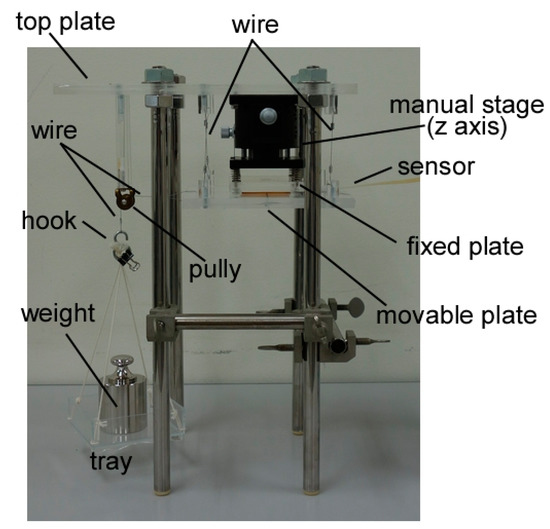 A shear force application test was performed using a self-built testing apparatus (Figure 4) with a fixed plate and a movable plate. These plates were parallel and horizontally disposed. The distance between them was adjustable so that the sensor was pinched between them. A wire was connected to the movable plate, and the other end of the wire was passed through a pulley and suspended a tray. Shear force was applied by loading a weight on the tray.