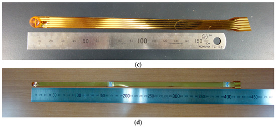 Photographs of the sensor are shown in Figure 5. The diameter of the sensor head (diameter of the covering electrode film) was about 10 mm, as previously stated. The actual thickness of the sensor was about 0.7 mm measured with a caliper, though the total thickness of materials was 0.6 mm. The left side silver bright parts in Figure 5a were solders attributed to the unintended contact of soldering iron during the bonding work of pads of basal and covering films. The soldering tightly bonded the covering and the basal electrode films, and problems such as cracks were not found. It was hard to peel the two films from each other. The length of the wiring pattern was about 17 cm, except for the terminal part due to the spatial limitation of the chamber size of our evaporator (see Figure 5c). However, it was possible to elongate it by at least 40 cm by soldering another wiring-patterned film (see Figure 5d). The thickness of the junctions did not exceed 0.6 mm, including the thickness of the protecting tape.