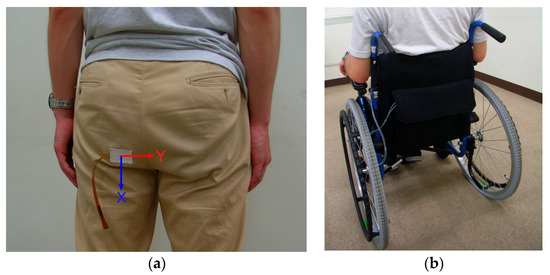 Landscape of a demonstrative measurement using a wheelchair: (a) Shear force sensor was attached to the trouser cloth; and (b) Experimental subject sat in a wheelchair. The mobile measurement system was housed in the rear pocket.
