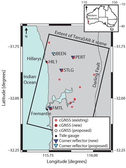 The distribution of ground-based geodetic infrastructure for measuring vertical land motion (VLM) in the Perth region, including: new, proposed and existing continuous GNSS (cGNSS); corner reflectors (new and proposed); and existing tide gauges. The rectangle shows the extent of TerraSAR-X InSAR scenes. The extent of the Sentinel-1B InSAR scenes covers the entire region. STLG—Stirling; PERT—Perth; FMTL—Fremantle; BEEN—Beenyup wastewater injection plant; HIL1—Hillarys. Inset: Map of Australia with the study region highlighted by the red rectangle.