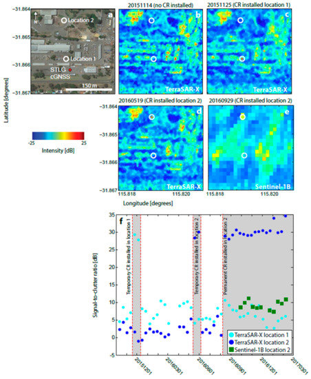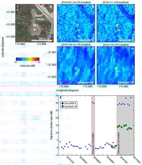 The first CR test installations were made at two existing cGNSS sites: Perth and Stirling (PERT and STLG in Figure 1 and Table 1), as detailed in Table 2. In both cases, the CR was temporarily deployed for two overpasses of TSX (~20 days). Figure 2 shows backscatter intensity images at PERT for the CR located 34 m from the cGNSS. This site has few other man-made structures, therefore low levels of background clutter (−12 dB on average for TSX over the area shown in Figure 2b before temporary CR deployment). Consequently, the CR is clearly visible in the intensity imagery, with SCRs of ~30 dB for TSX and ~13 dB for Sentinel-1B.